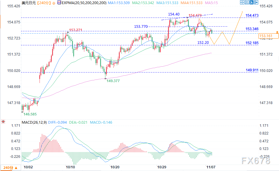 美元兑日元受美元走弱与日本国内喜忧参半信号的双重影响,短期驱动因素是为日元提供临时支撑的风险情绪。技术面来看,该货币对处于盘整阶段,短期内倾向回调至152.20。但中期前景仍暂呈看涨,若能成功向上突破当前区间,目标位155.70。