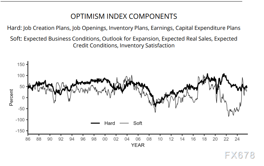 下图可以看出中小企业的乐观预期随着24年底降息以及特朗普上台快速提振,因此他们扩大生产,但实际情况并没有明显改善,反而收到融资成本和整体劳动力市场条件下滑,遭遇快速反噬。