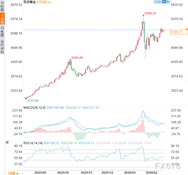 周四(2月26日)亚市时段,现货黄金震荡上行,现交投于每盎司5185美元附近,日内涨幅约0.45%,较2026年1月创下的5596.33美元/盎司历史峰值有明显距离,部分投资者开始担忧这是否预示长期动能减弱。